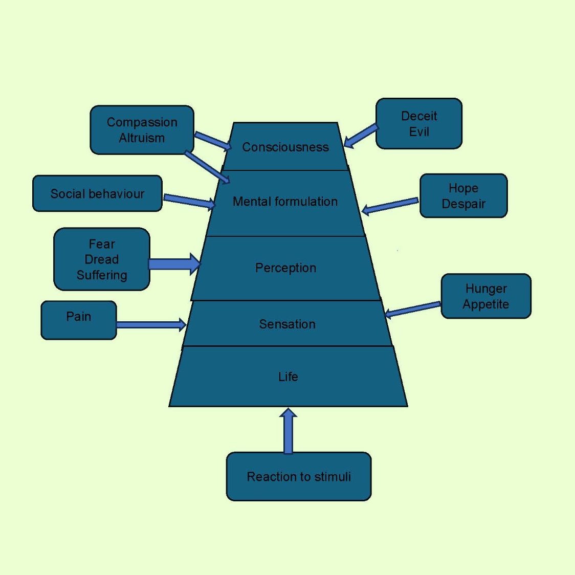 All animals are sentient but some animals are more sentient than others. The Buddha, who recognised all life as sentient, outlined five skandhas of sentience that constitute, to my mind, the most scientific approach to the analysis of sentience, and degrees of sentience in life forms. These are defined (in English) as matter, sensation, perception, mental formulation and consciousness. I have difficulty with the word matter to describe the most basic elements of sentience as displayed in plants. All things that have mass, animate or inanimate, have matter. With due respect to the Buddha, I prefer to describe this simplest and most comprehensive description of living matter simply as life. My diagram illustrates the five skanda of sentience with examples of sensations, feelings and emotions attached to each level. It includes examples of a range of primitive and more complex sensations and emotions that may impact on one or more of the five skandhas. These are not intended to be definitive but presented as a basis for discussion.